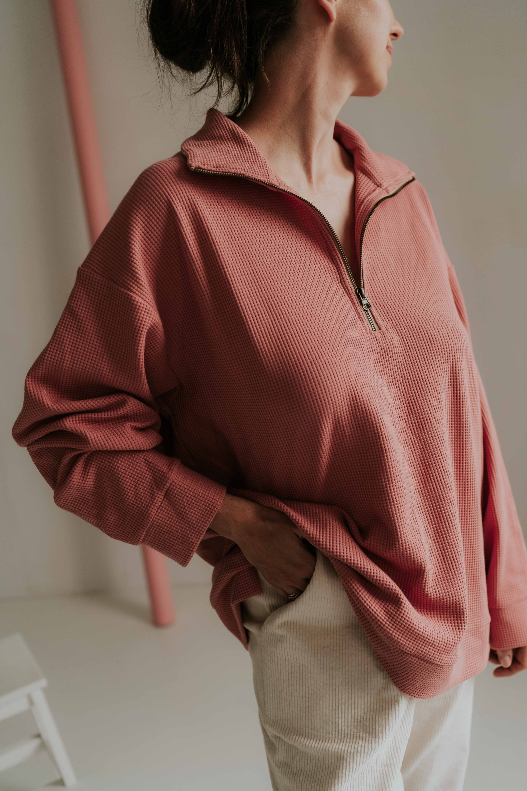 Waflowa bluza w kolorze coral rose jest dostępna w 4 rozmiarach (wymiary zostaną uzupełnione 16 stycznia)