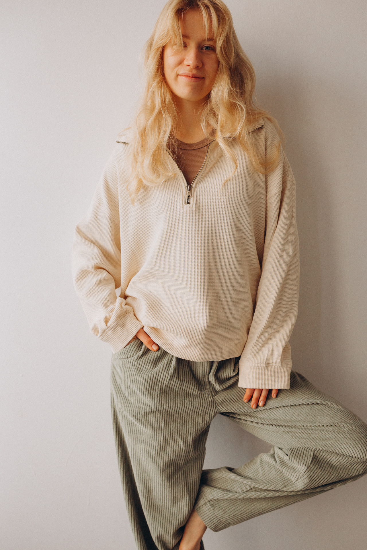 Waflowa bluza w kolorze oat milk dostępna jest w 4 rozmiarach (wymiary zostaną uzupełnione 16 stycznia)