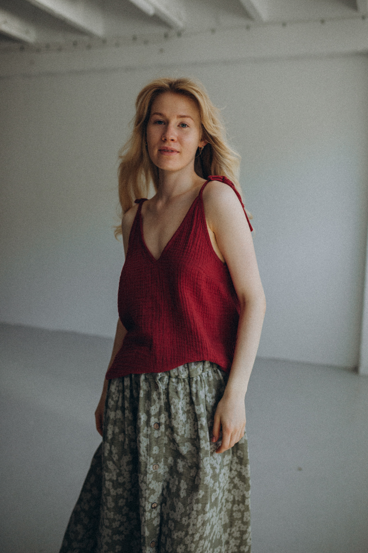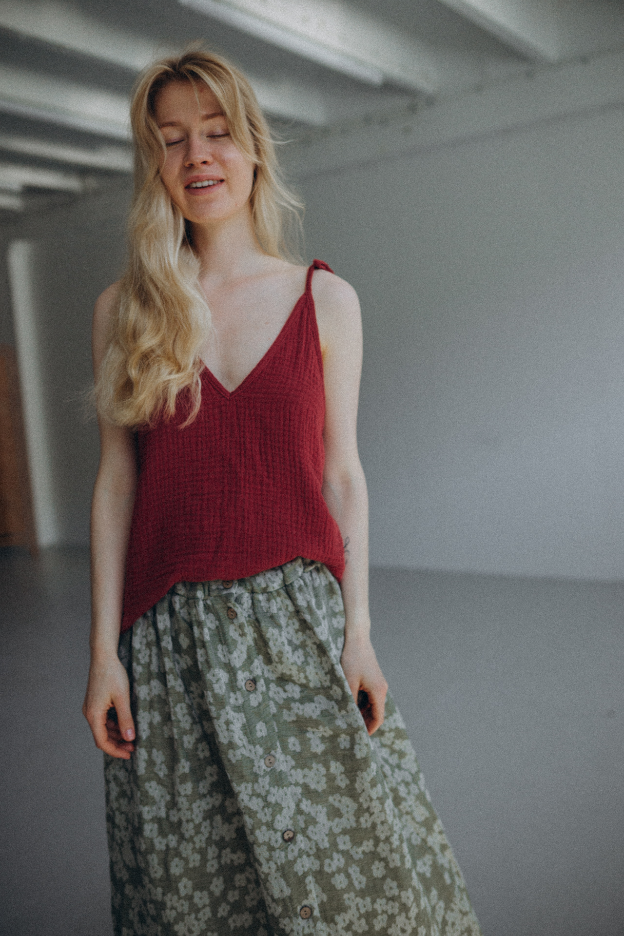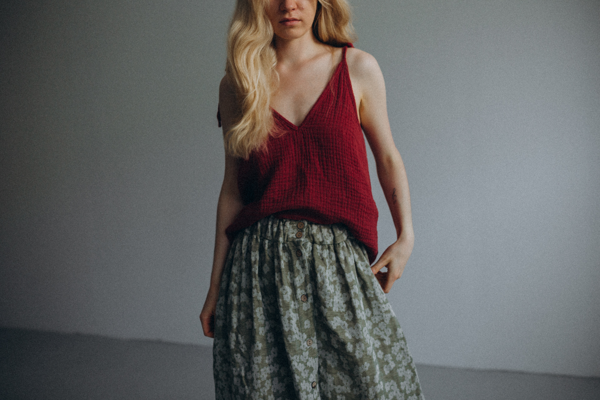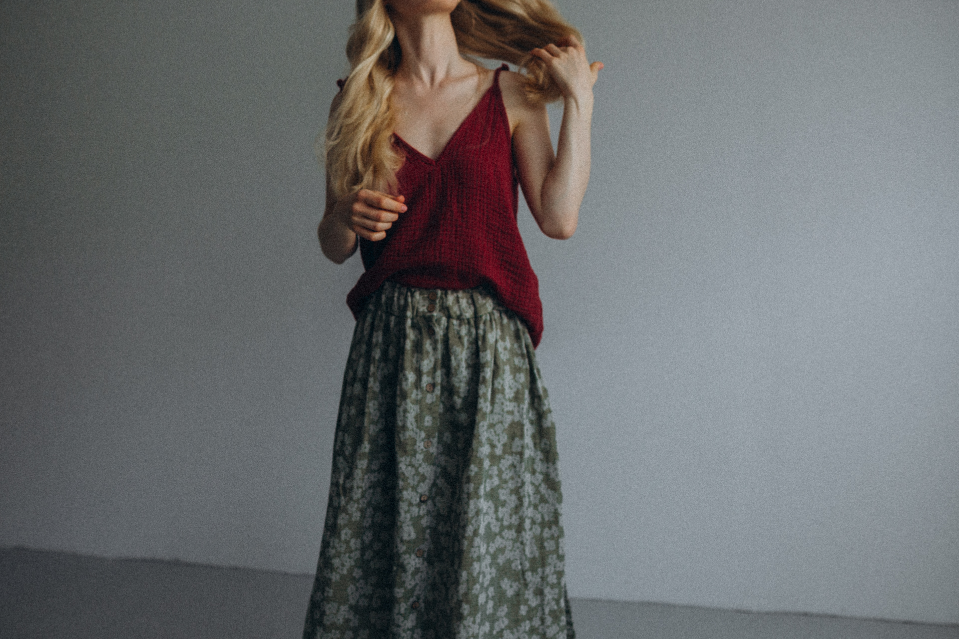 Spódnica Swobodnie doskonale łączy się z topem Prosto. Jeśli wybierzesz ten sam kolor, będą wyglądać razem jak sukienka. W chłodniejsze dni dodaj sztruksową koszulę Totally. Wolisz bardziej classy? Połącz ją z koszulą Miękko. Stworzą parę, która idealnie ubierze Cię na letnie przyjęcia i spotkania.