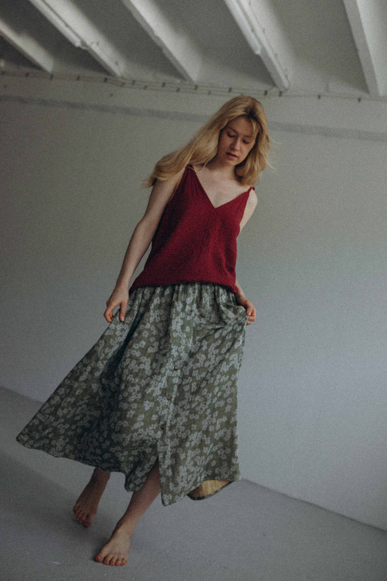 Uwielbiamy ten czas, kiedy słońce muska promieniami łydki… Spódnica Swobodnie ma na całej długości guziczki, dzięki którym łatwo zmienisz głębokość jej rozporka. Możesz zakryć nogi albo… wręcz przeciwnie!